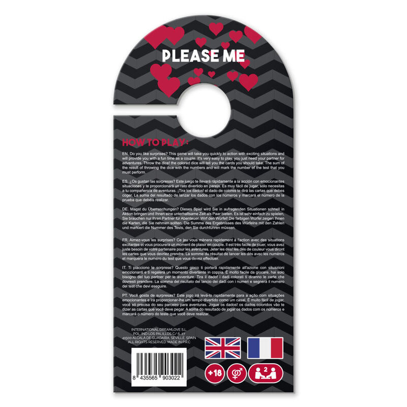 Aimez-vous les surprises? Ce jeu vous amènera rapidement à l'action avec des situations passionnantes et vous offrira un moment de plaisir en couple. C'est très facile à jouer, vous avez juste besoin de votre partenaire d'aventure. Jetez les dés! Les dés colorés vous indiqueront les cartes que vous devez prendre. La somme des résultats de lancer les dés avec les nombres et marquera le numéro du test que vous devez lancer.