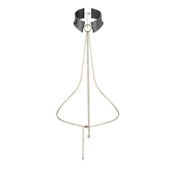 Acessório de gargantilha de malha metálica ajustável e cinto de corrente.