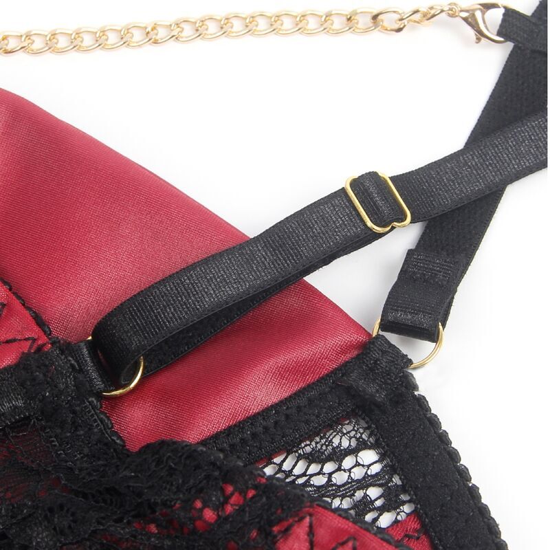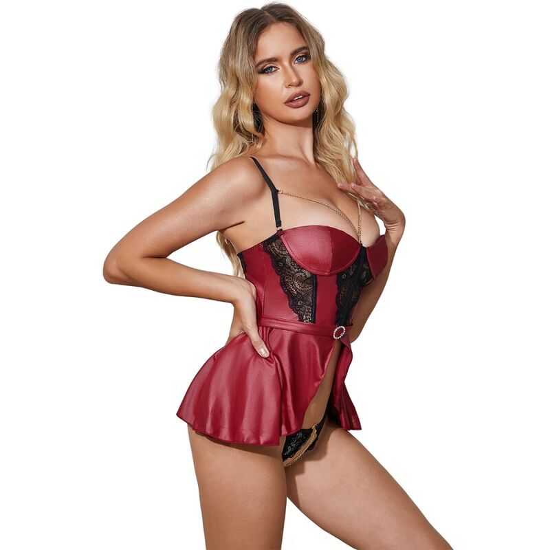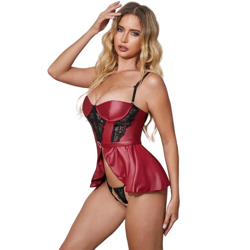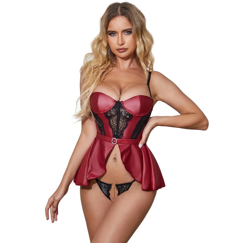 Este set de corset y tanga es una expresión de sensualidad y estilo audaz. El corset, en un tono burdeos profundo, presenta un diseño elegante con detalles de encaje que añaden un toque de feminidad y sofisticación. Lo más distintivo de este corset son las cadenas desmontables que añaden un elemento de fetichismo y sensualidad, creando un contraste fascinante con el encaje y el tejido de imitación de cuero.