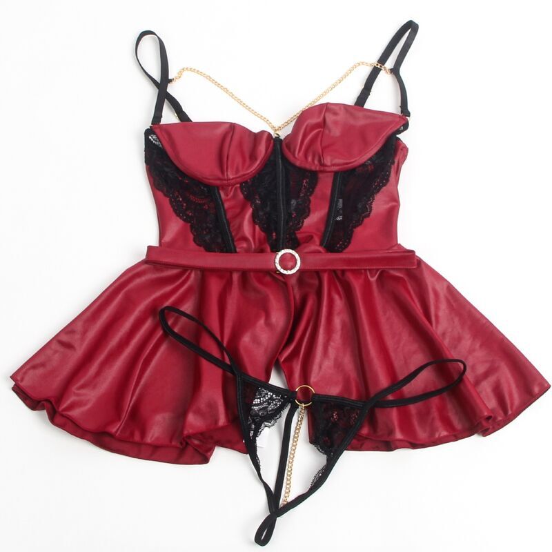 La tanga a juego complementa perfectamente el corset, confeccionada en el mismo tejido de imitación de cuero y encaje, creando una armonía visual entre las dos piezas. Ofrece una cobertura mínima y un ajuste cómodo para completar este conjunto provocativo.