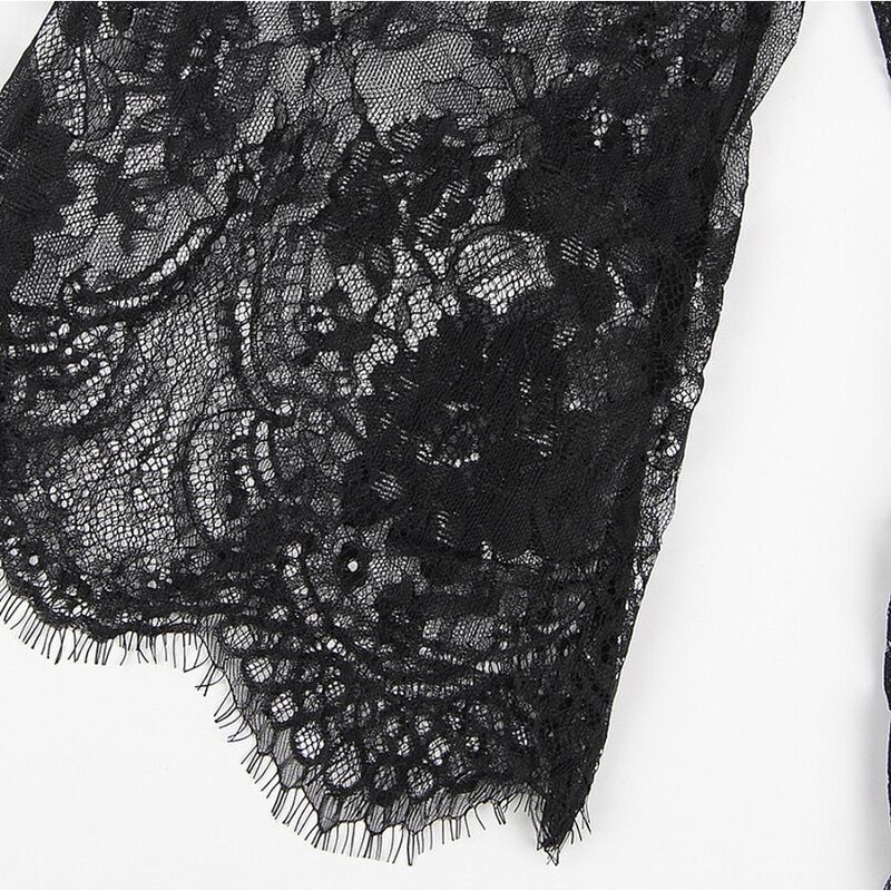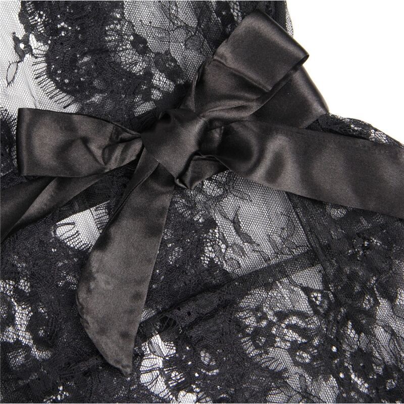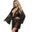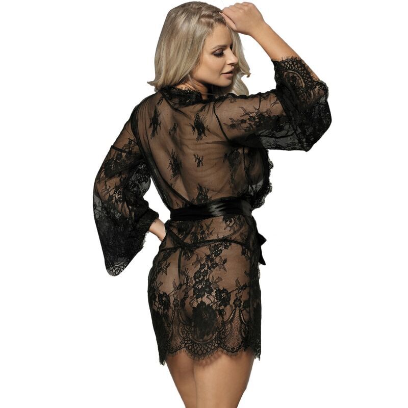 La bata corta presenta un diseño seductor de encaje negro con detalles de pestañas en las mangas y el dobladillo. Sus mangas largas añaden un toque de sofisticación, mientras que el encaje delicado agrega un toque de feminidad y glamour.