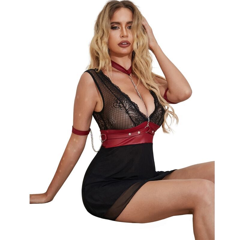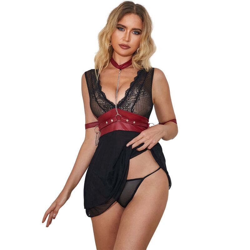 Este babydoll es una pieza de lencería audaz y provocativa que combina elementos sensuales con un toque de bondage. Fabricado en una mezcla de malla negra, encaje y cuero sintético, este babydoll presenta un diseño único que combina lo delicado con lo atrevido.