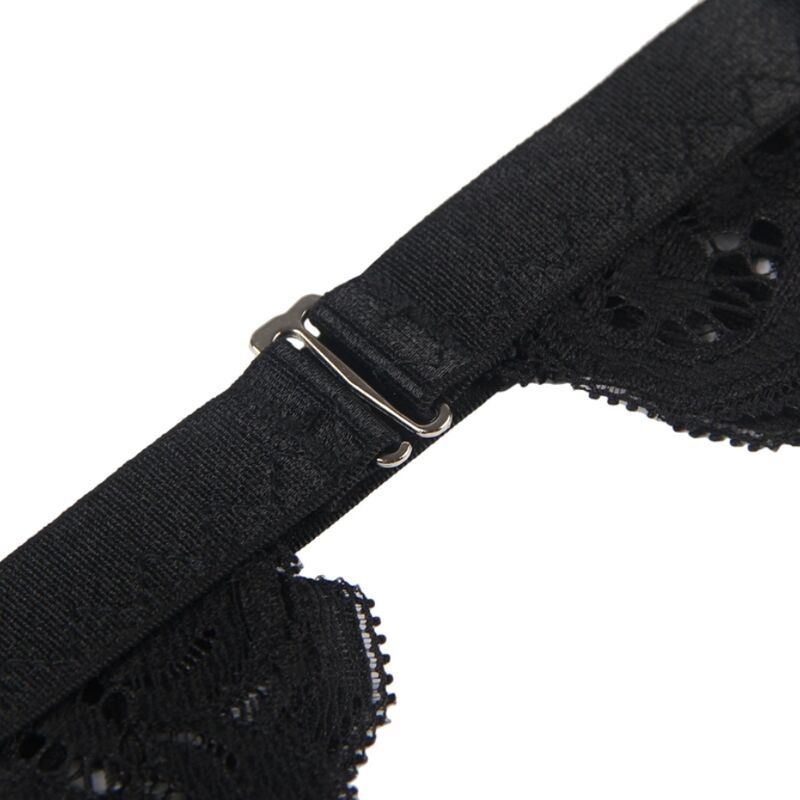 Ideal para una noche especial o para sorprender a tu pareja, este conjunto de sujetador, tanga y liga es la elección perfecta para una apariencia seductora y elegante.
