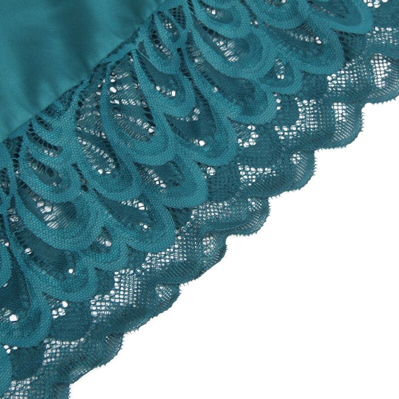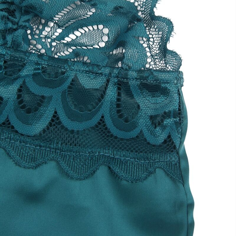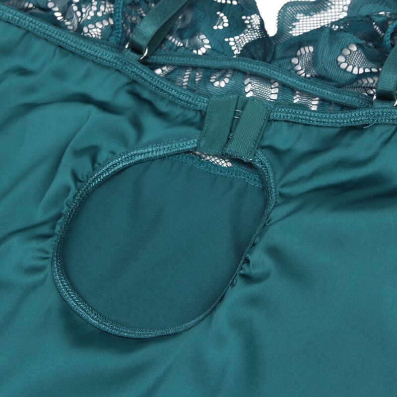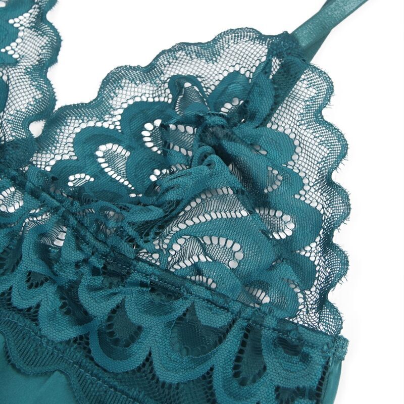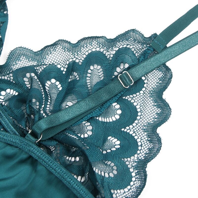 Este babydoll verde es una combinación exquisita de encaje floral y tela suave, diseñado para cautivar y seducir. La parte delantera presenta un estilo clásico y elegante, mientras que la parte posterior revela un detalle encantador con encaje floral.