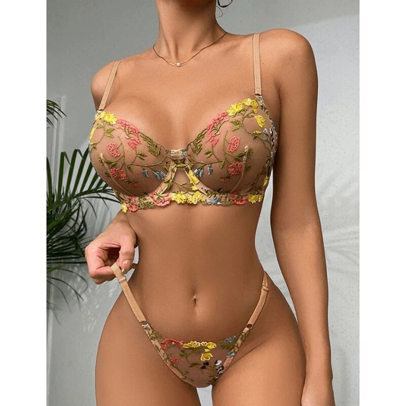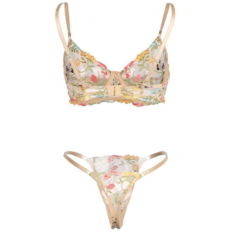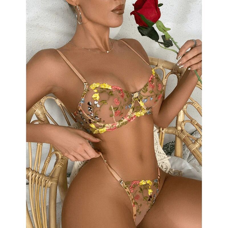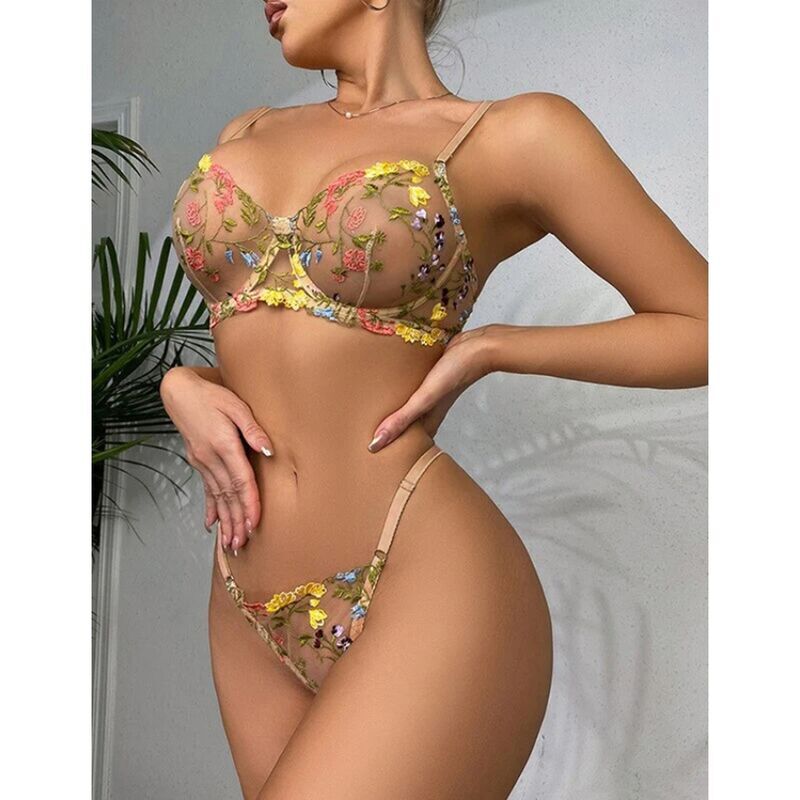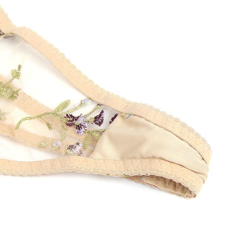 La tanga a juego presenta el mismo diseño floral bordado, complementando el sujetador de manera encantadora. Su diseño de corte bajo y cobertura mínima añade un toque de coquetería y sensualidad.