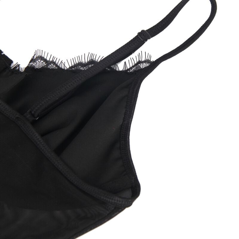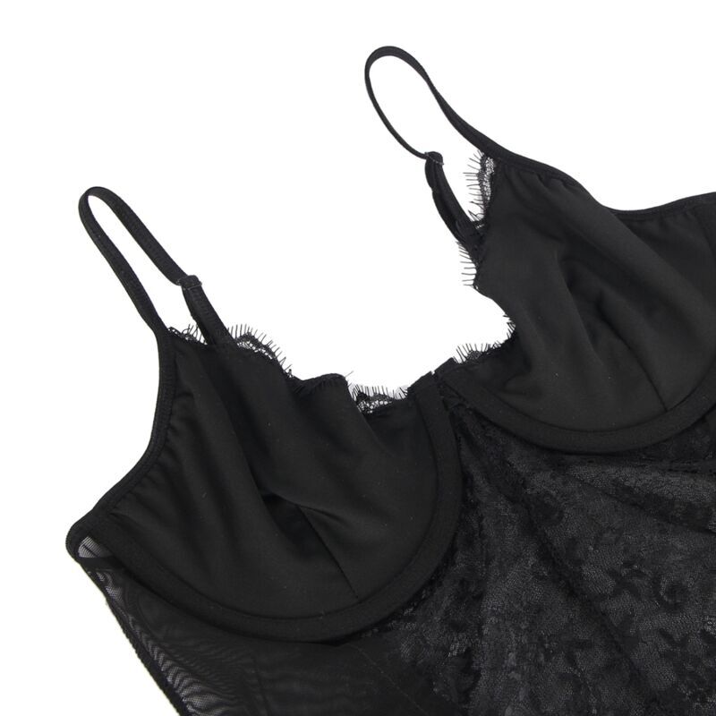 El diseño de encaje negro de alta calidad agrega un toque de sofisticación y sensualidad, mientras que la abertura en la entrepierna añade un elemento de juego y provocación. Con aros incorporados, este teddy proporciona soporte adicional y realza el busto de manera elegante.
