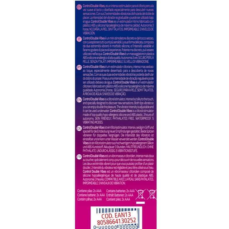 Con sus 2 extremidades vibratorias disfrutarás del doble de place. La intensidad del vibrador es graduable y puede ser utilizado bajo el agua. Control Double Vibes es un estimulador íntimo fabricado con plástico ABS y silicona hipoalergénica de máxima calidad.