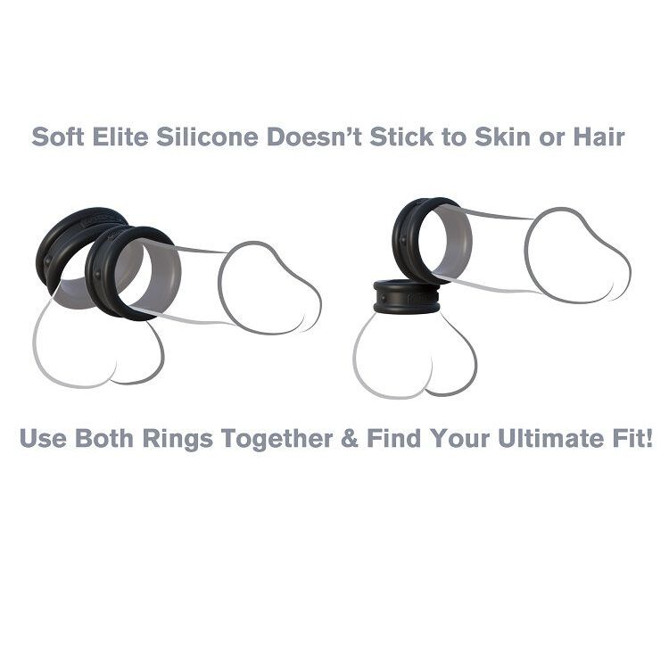 Set de dos anillos con diferentes medidas para que lo utilices en el pene y los testículos. Están fabricados en Silicona Elite muy comfortable de color negro y tienen un grosor de un centímetro aprox, algo ideal para utilizarlo en largas sesiones de sexo. Los dos tienen diferentes diámetros, así podrás encontrar el tamaño exacto o podrás utilizar varios al unísono.