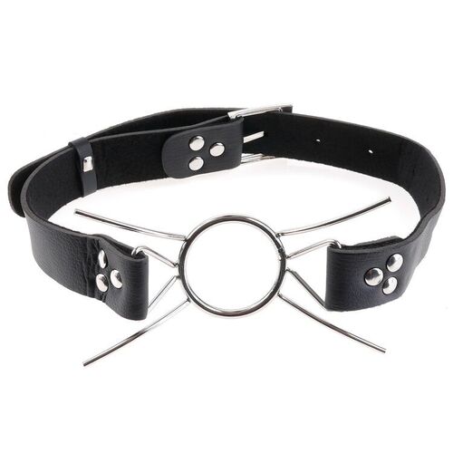 El aro y las piernas evitan que la boca se cierre dejando tu boca ampliamente abierta para meter todo lo que quieras. El diámetro del del aro es de 1.5 pulgadas y la mordaza está sujeta a una correa de cuero que se sujeta por detrás y mantiene mordaza firmemente en su sitio.