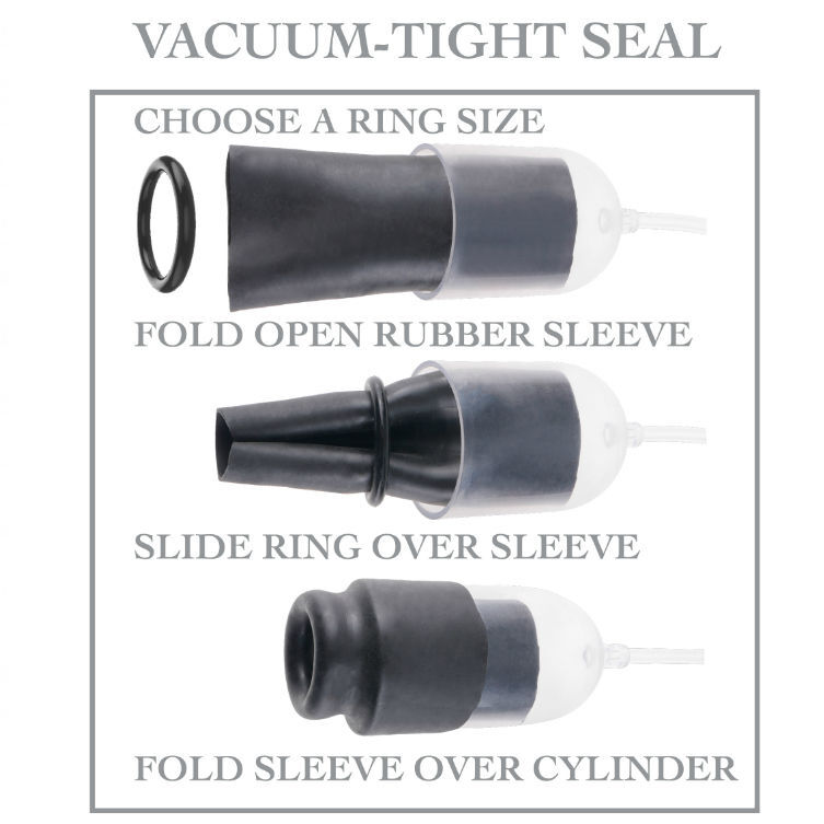 Elige un anillo primero, deslízalo sobre la manga, dobla la manga sobre el cilindro inflador y disfruta de un sello hermético sobre el glande. Cada vez que se presione la bola infladora, la goma de la manga se agarra al miembro y se desliza arriba y abajo sobre él