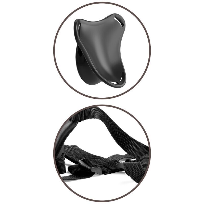 As tiras de náilon Body Dock podem ser facilmente ajustadas para caber na maioria dos tamanhos e tipos de corpo. A placa de encaixe mede 8,6 cm de diâmetro e pode acomodar qualquer vibrador com ventosa com diâmetro menor que este tamanho.