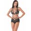 El sujetador consta de copas triangulares con tirantes finos y decorativos. Además de los tirantes estándar, hay tirantes adicionales que recorren el escote, enfatizando el busto y haciendo que el conjunto parezca un todo unificado. La braguita también tiene tirantes negros con hebillas doradas a modo de cierre. Se cruzan alrededor de la cintura, adelgazando ópticamente el cuerpo y dándole proporciones sexys en forma de reloj de arena. Las encantadoras alas a los lados de las bragas hacen que las caderas parezcan más llenas. La parte inferior de encaje de la ropa interior cubre toda la parte inferior, por lo que también se puede usar todos los días y debajo de cualquier tipo de vestimenta.