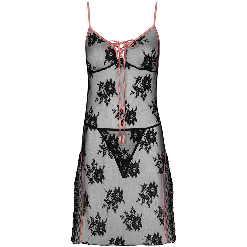 Karonin Dubarry Collection es un conjunto compuesto por un sensual camisón y tanga negro a juego. El conjunto está confeccionado en suave encaje calado y adornado además con una sutil cinta rosa empolvado atada al busto. Una combinación tan contrastante de rosa dulce y negro feroz hace que el atuendo agregue coraje y confianza en uno mismo. A su vez, el material del conjunto consigue que su usuaria se sienta lo mejor posible en su propio cuerpo. El encaje está confeccionado en poliamida agradable al tacto, que no raya y se adapta bien a la forma de la figura femenina.