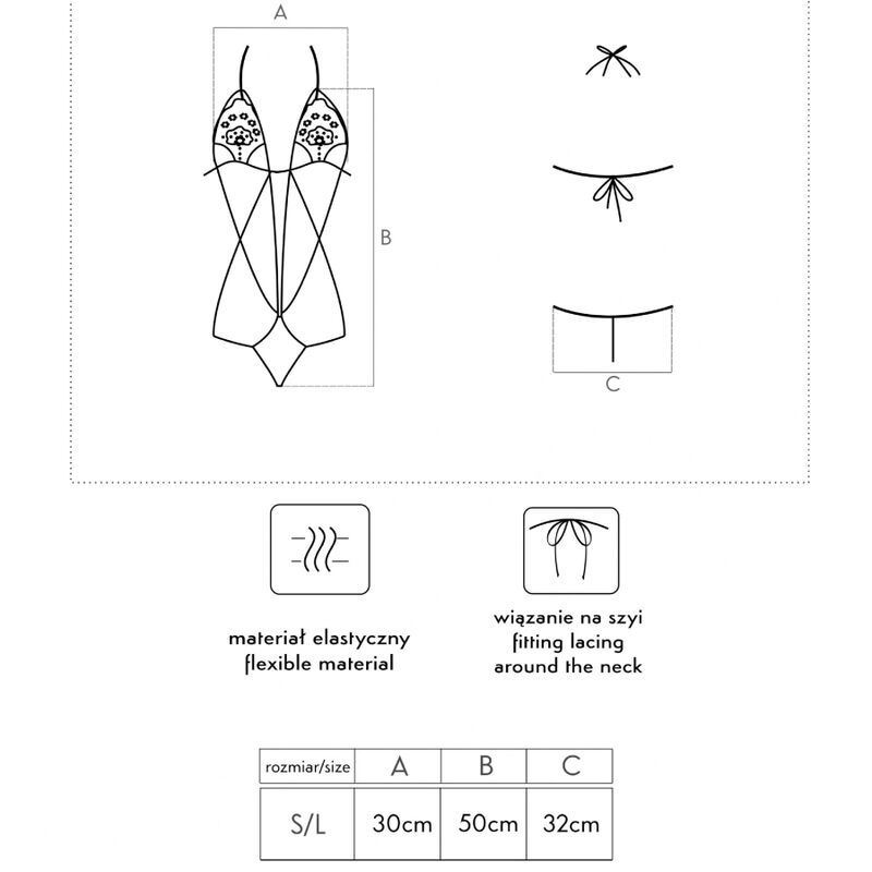 Un body diminuto y sensual encenderá tu imaginación y convertirá la noche en una experiencia inolvidable. El body Luisina consta de un delicado sujetador de encaje y un tanga con un encantador motivo de rosas. El tanga y el sujetador están conectados con una maraña de tirantes que enfatiza la cintura y las curvas femeninas. Un sujetador que revela parcialmente los pechos mientras los levanta ligeramente agrega un toque increíble a todo el look. Los tirantes ingeniosamente dispuestos que fluyen hacia abajo entre los pechos hasta el tanga estilizan ópticamente la figura. Las caderas y los hombros prácticamente expuestos, así como la espalda y los glúteos, que están decorados solo con un tirante de tanga y dos tiras, lo convierten en una propuesta atrevida para ella.