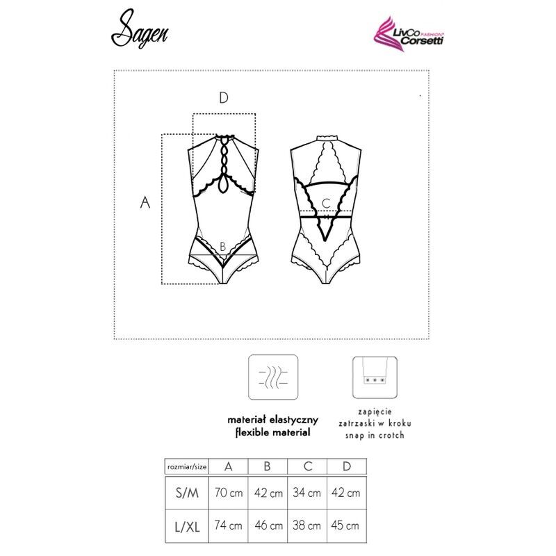 Body Sagen é uma proposta para mulheres autoconfiantes que querem enfatizar seu apelo sexual. O traje é feito de malha e renda, o que o torna transparente. O modelo é construído até o pescoço. Possui recortes sensuais ao longo de toda a linha do esterno, presos com botões revestidos de tecido brilhante. Ao mesmo tempo, cobrir os seios atrai a atenção para eles. Na parte inferior, o body de renda cobre os quadris e revela as nádegas, modelando-as de forma eficaz. Outro elemento característico do traje é um grande recorte nas costas, cortado com um cinto na cintura.
