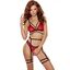 O sutiã, em vermelho vibrante com detalhes em preto profundo, realça o busto com um ajuste confortável e elegante, enquanto a calcinha combinando proporciona um equilíbrio entre cobertura e sedução. A cinta-liga, com alças ajustáveis e design aerodinâmico, completa o look com um toque provocante e sofisticado, ideal para combinar com meias-calças sensuais.